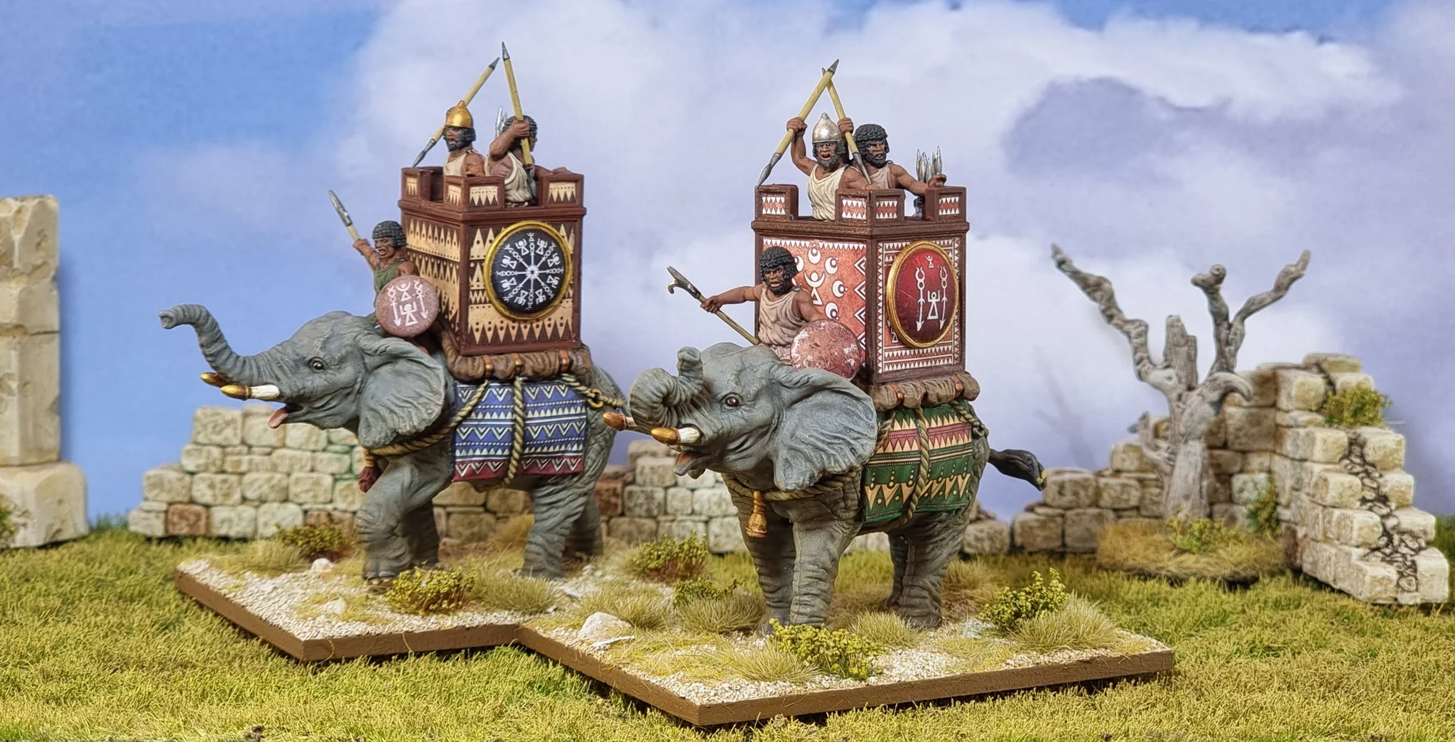 Miniaturas de 28 mm de alta calidad. Este magnífico set incluye dos elefantes de 28 mm y opciones de tripulación para las tripulaciones cartaginesas, romanas, ptolemaicas y númidas.