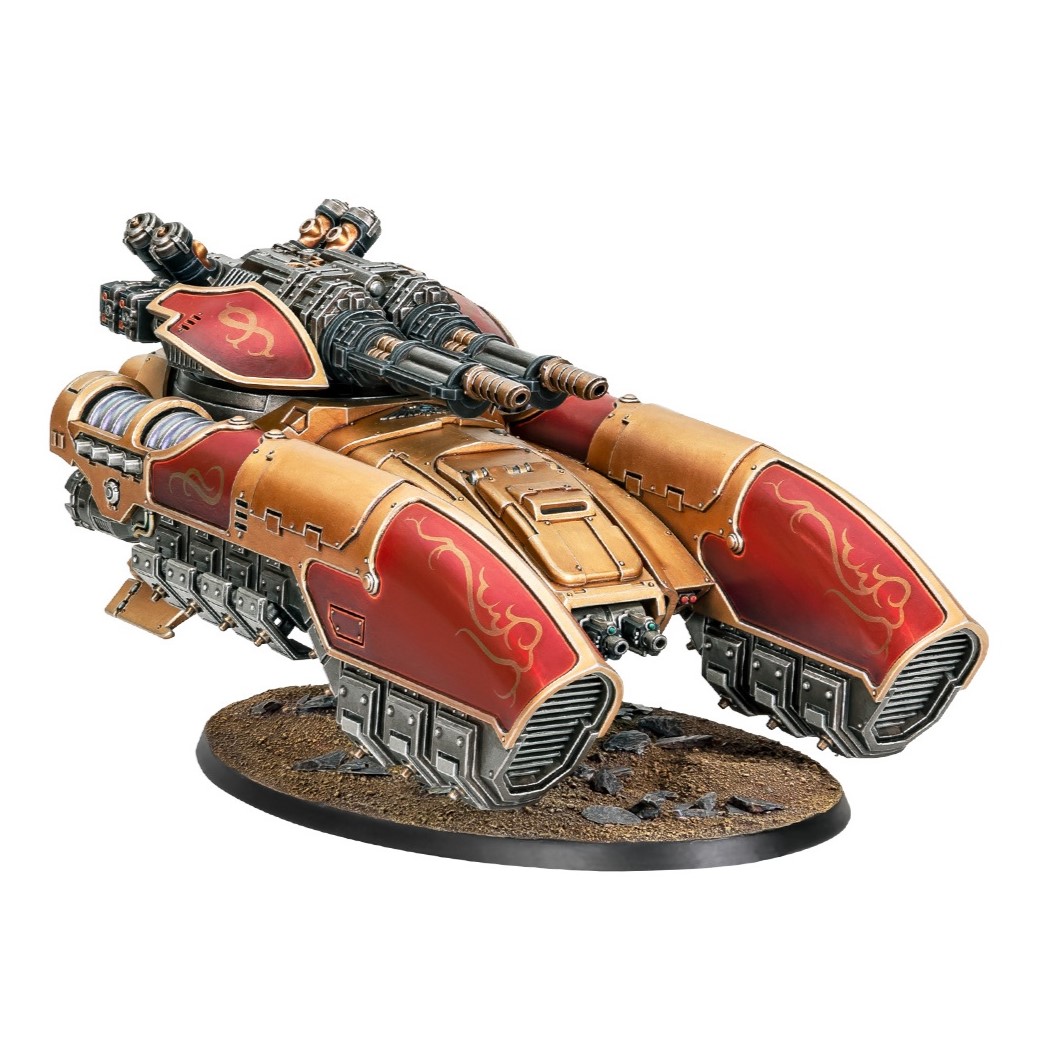 La variante Aniquilador del tanque gravitatorio Caladius sustituye el twin Iliastus accelerator cannon por una twin Arachnus blaze carronade. El modo de disparo concentrado te permite abrir brechas en los tanques más acorazados del enemigo, mientras que las ráfagas del modo de disparo con AP3 derriten hasta las servoarmaduras. Al igual que con el kit Caladius, puedes elegir entre un twin lastrum bolt cannon o un twin neutronium cascade projector montado en el frontal del casco.