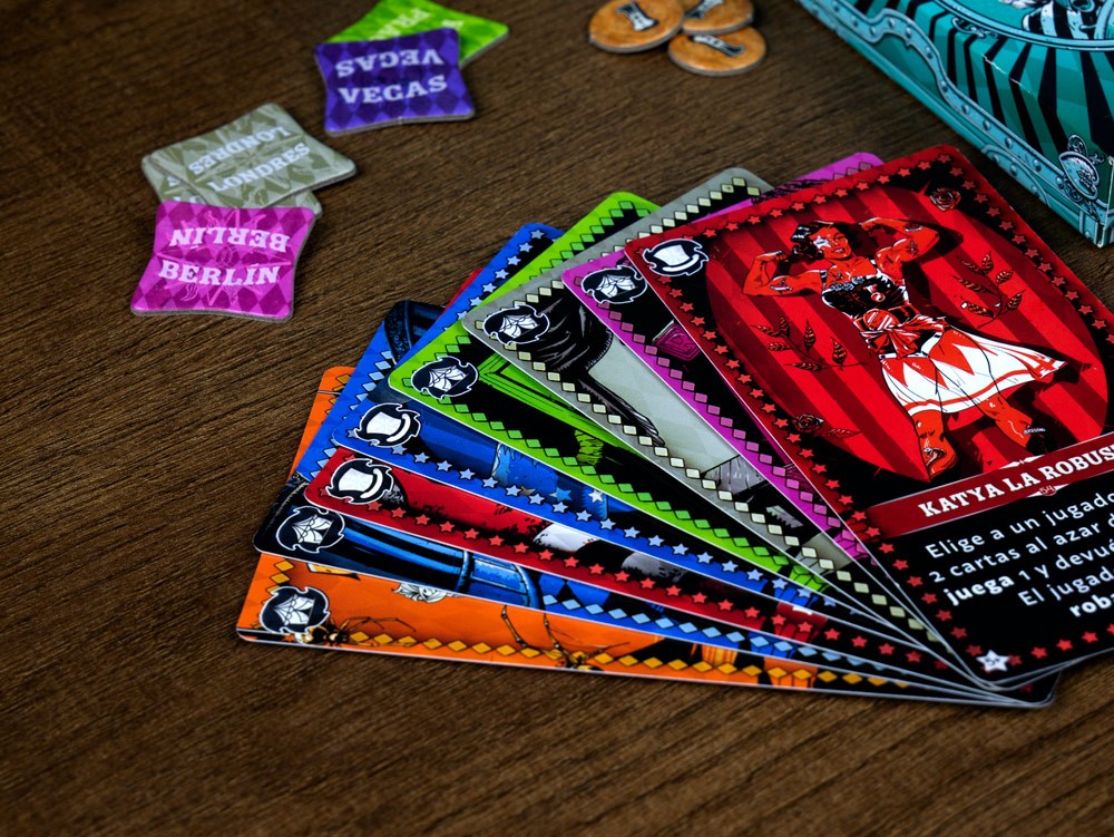 CIRCO MALDITO es un juego de cartas de atracciones espeluznantes para 4-8 jugadores en el que pujas por magníficas atracciones y negocias con espectáculos vecinos para conseguir formas únicas de sumar puntos. Aterroriza y emociona a los cansados trotamundos: ¡Ngozi la Temeraria y Odval el Infalible te esperan dentro!
