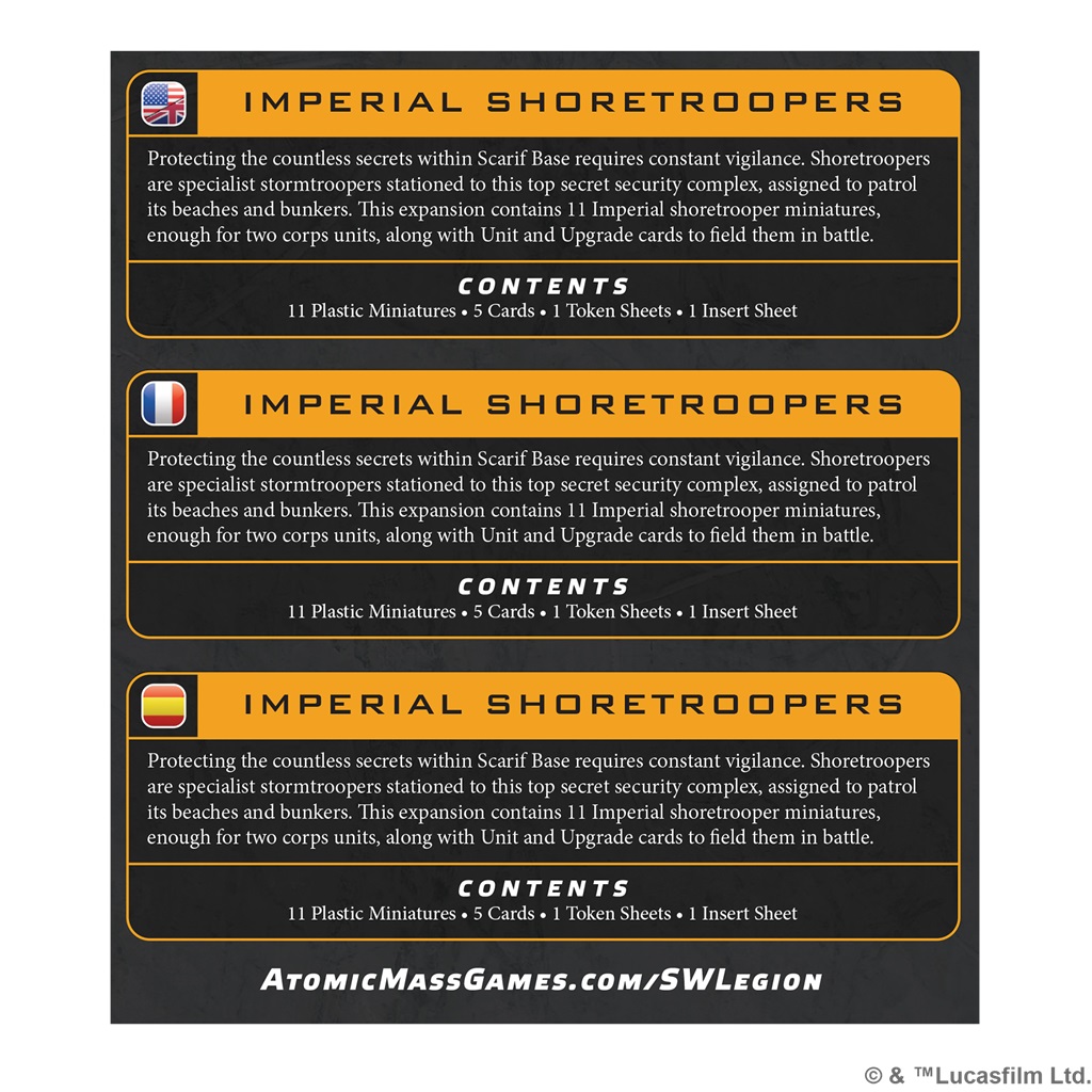 Strengthen your Galactic Empire infantry with the Imperial Shoretroopers Unit Expansion for Star Wars Legion. This updated reissue of SWL41 features refreshed SWQ multilingual packaging and cards while maintaining the original sculpts. The expansion provides two Corps units, including a Shoretrooper squad and a DF90 Mortar Trooper detachment, offering entrenched firepower and specialized battlefield roles. A valuable addition for commanders looking to diversify and enhance their Empire ground forces.