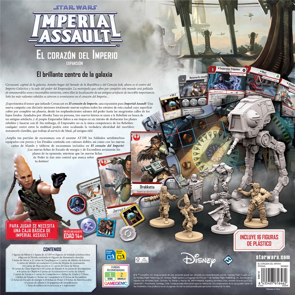 ¡Experimenta el temor que infunde Coruscant en El corazón del Imperio, una expansión para Imperial Assault! Una nueva campaña con dieciséis misiones totalmente nuevas explora todos los estratos de esta ciudad cuya superficie cubre por completo un planeta, desde los resplandecientes salones del poder hasta las mugrientas calles de los bajos fondos. Ayudados por Ahsoka Tano en persona, tres nuevos héroes se unen a la Rebelión en busca de un antiguo artefacto, y el propio Emperador lidera a sus tropas en un intento de desbaratar los planes rebeldes y hacerse con él. Sin embargo, el Emperador no es la única competencia de los Rebeldes: cualquier rostro entre la multitud podría estar ocultando la verdadera identidad del mortífero metamorfo clawdita, que trabaja al servicio de Maul, ¡el antiguo sith!