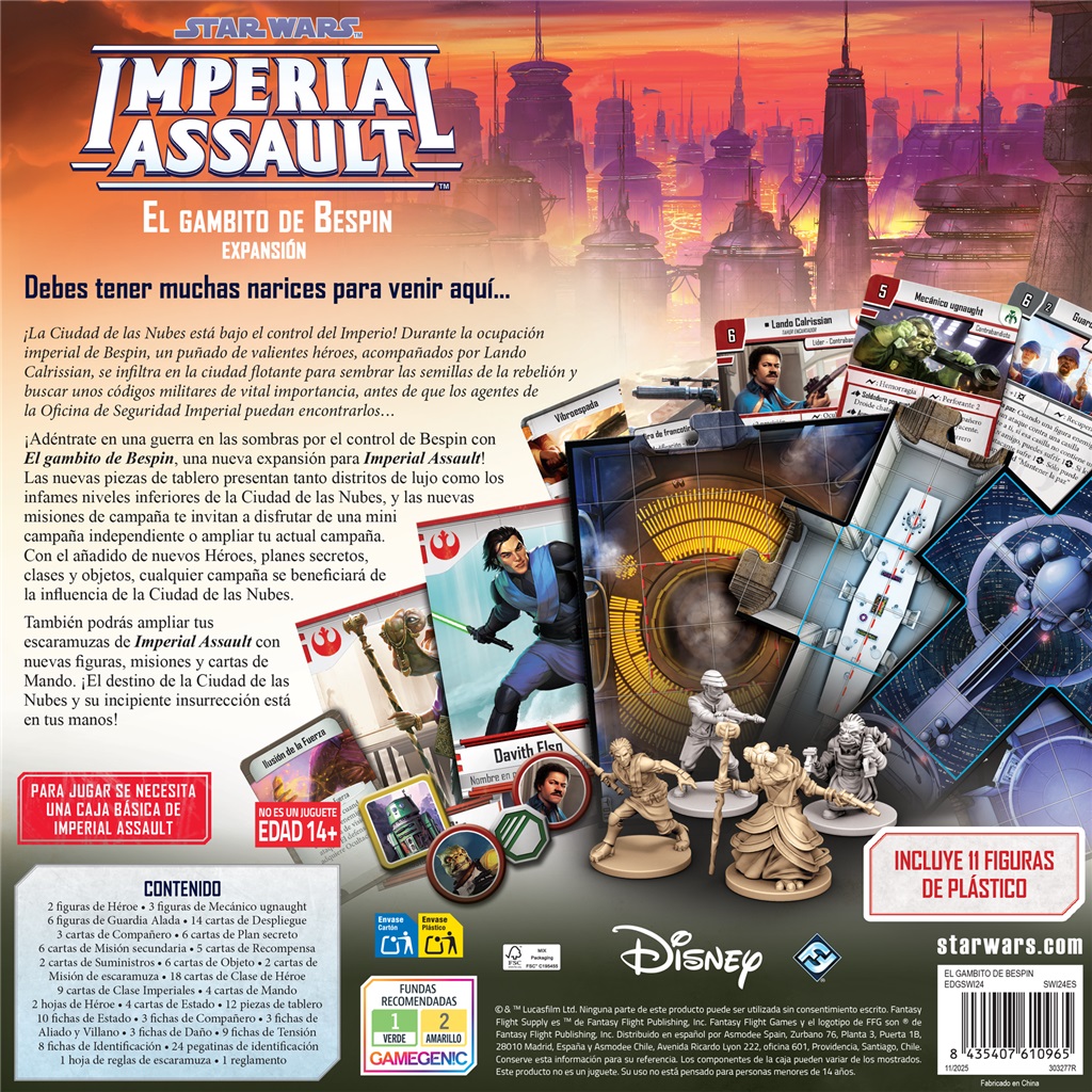 ¡Adéntrate en una guerra en las sombras por el control de Bespin con El gambito de Bespin, una nueva expansión para Imperial Assault! Las nuevas piezas de tablero presentan tanto distritos de lujo como los infames niveles inferiores de la Ciudad de las Nubes, y las nuevas misiones de campaña te invitan a disfrutar de una mini campaña independiente o ampliar tu actual campaña. Con el añadido de nuevos Héroes, planes secretos, clases y objetos, cualquier campaña se beneficiará de la influencia de la Ciudad de las Nubes.