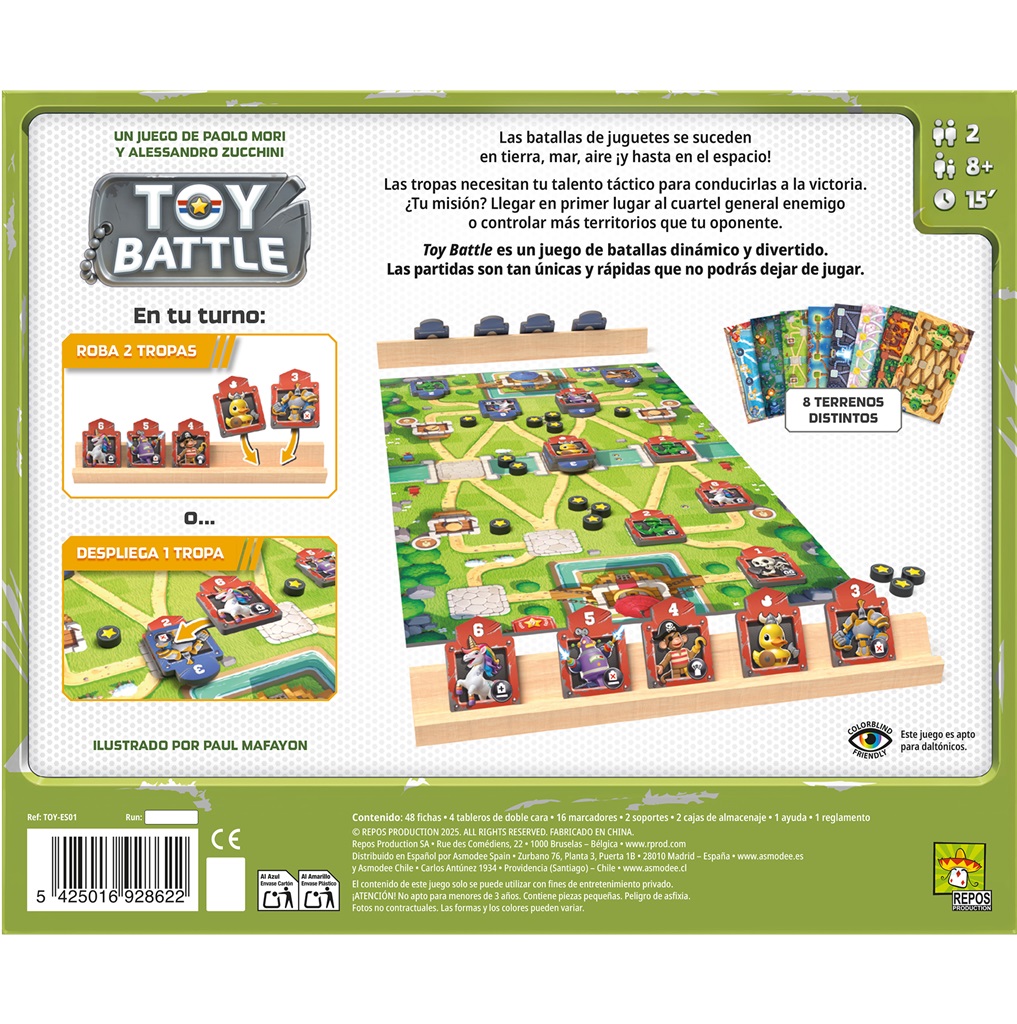 48 Tropas, 4 tableros (8 Terrenos), 16 Medallas, 2 soportes, 2 cajas de almacenaje y 1 ayuda